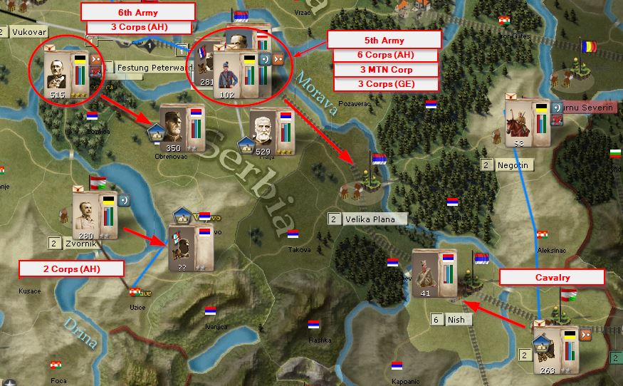 Here's the situation. 9 AH Corps, including 3 understrength MTN corps, plus 3 GE corps are on Belgrade. GE Corps will lead the push down to Velika Plana. Austrians will siege Belgrade and attack remaining Serbians in the area. Pirot has been taken with a Cav Corp (another coming) and will push up to Nish. Putnik is nowhere to been seen. I'm wondering if he got hurt in the last battle.