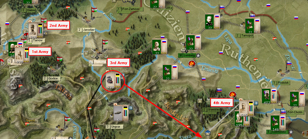 And here's the situation against Russia. He's consolidated 3 or 4 Armies on Lemberg. I have no idea what the Russian starting forces are in this game or how powerful they begin with, so I have no idea where everything is. I moved 3 Armies in and around Lemberg in the hopes he would attack quickly. He didn't. I tried to extricate them, as I simply don't have the firepower for a pitched battle yet. 1st Army lost around 14k to his 4k but was able to retreat. The next line of defense is the mountains southwest of Lemberg and southeast of Przesmyl. The 4th Army could take a swipe at a Russian Corp in Czernowitz, but there's still at least 1 Russian Army unaccounted for and this could be a trap, so I've decided to hold with them.