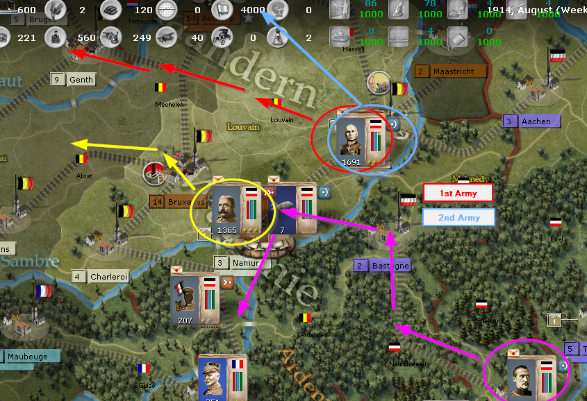 For this next week, the bombard regional decision card will punch through Leige. 1st Army will push on Genth. Marwitz's Cavalry corp will detach from 1st Army and take Bruges. 2nd Army will push on Antwerp. Von Quast and Emmich will detach from 1st and 2nd Armies and camp on Hasselt and Mechelen and take military control. 3rd Army wll push through Brussels and hold up at Alost. The 4rd Army will stop just north of Sedan.