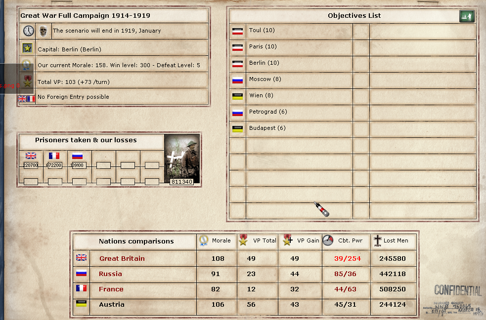 Looks like NM stayed pretty static this turn. Germany gained 2. I'm not sure how to interpret this. Under lost men, I'm seeing 225k losses for France and 145k losses for Britain to my 400k losses. However, looking under prisoners. That's showing another 530k worth of French and British prisoners of war.