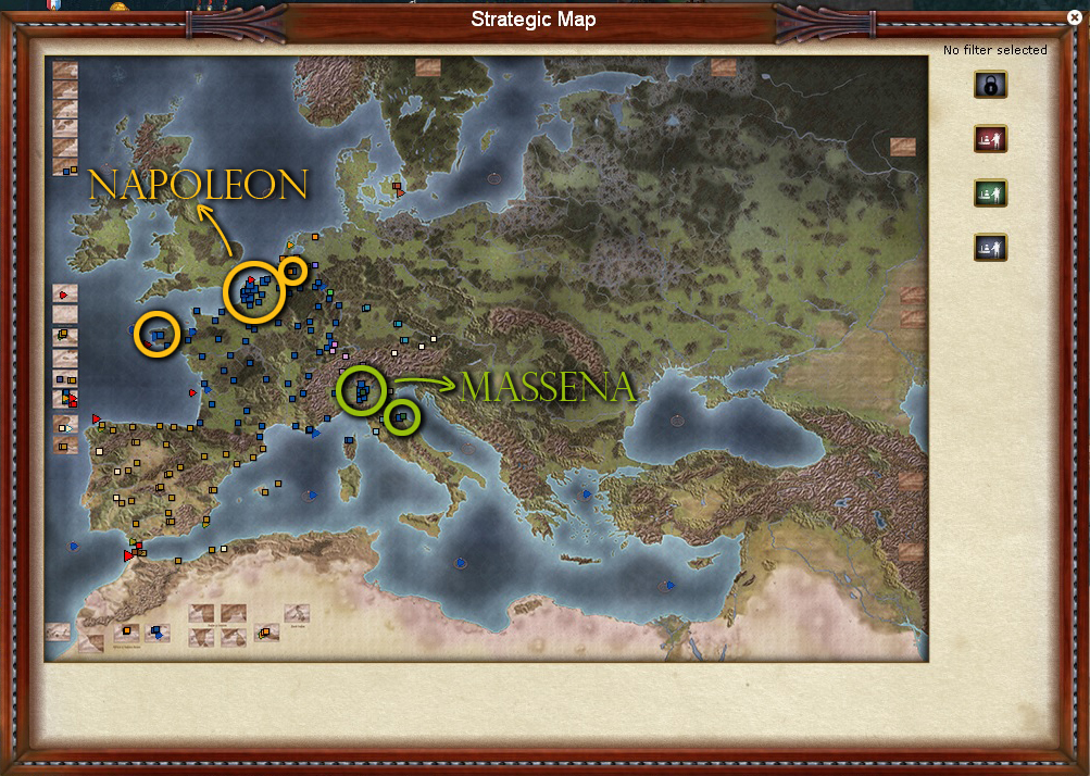 [color="#008080"]Davout's corps remains on the coast. Further south you can see the Lannes and Murat corps in Paris. The rest of Napoleon's army is moving towards the highlighted areas.[/color]
