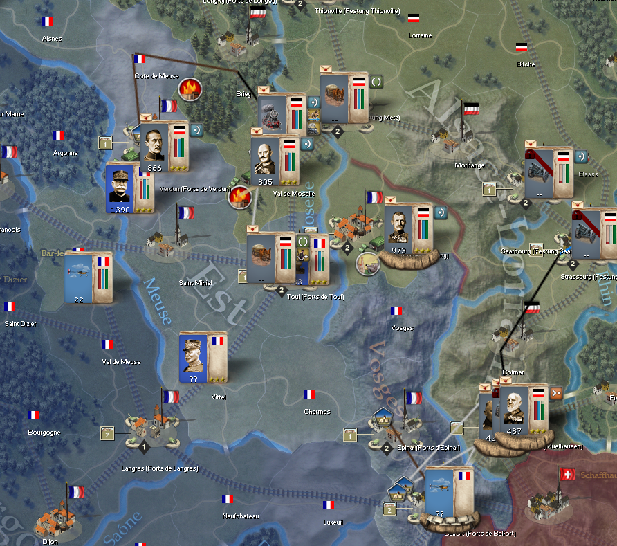 In Eastern France I am the first time endangered to a defeat as my 904CB force did auto retreat from Verdun, while my newly arriving 506CB force did not - REALLY??? Never trust the auto stance and retreats of generals...anyways took my opportunity to take more Belfort at the French border...