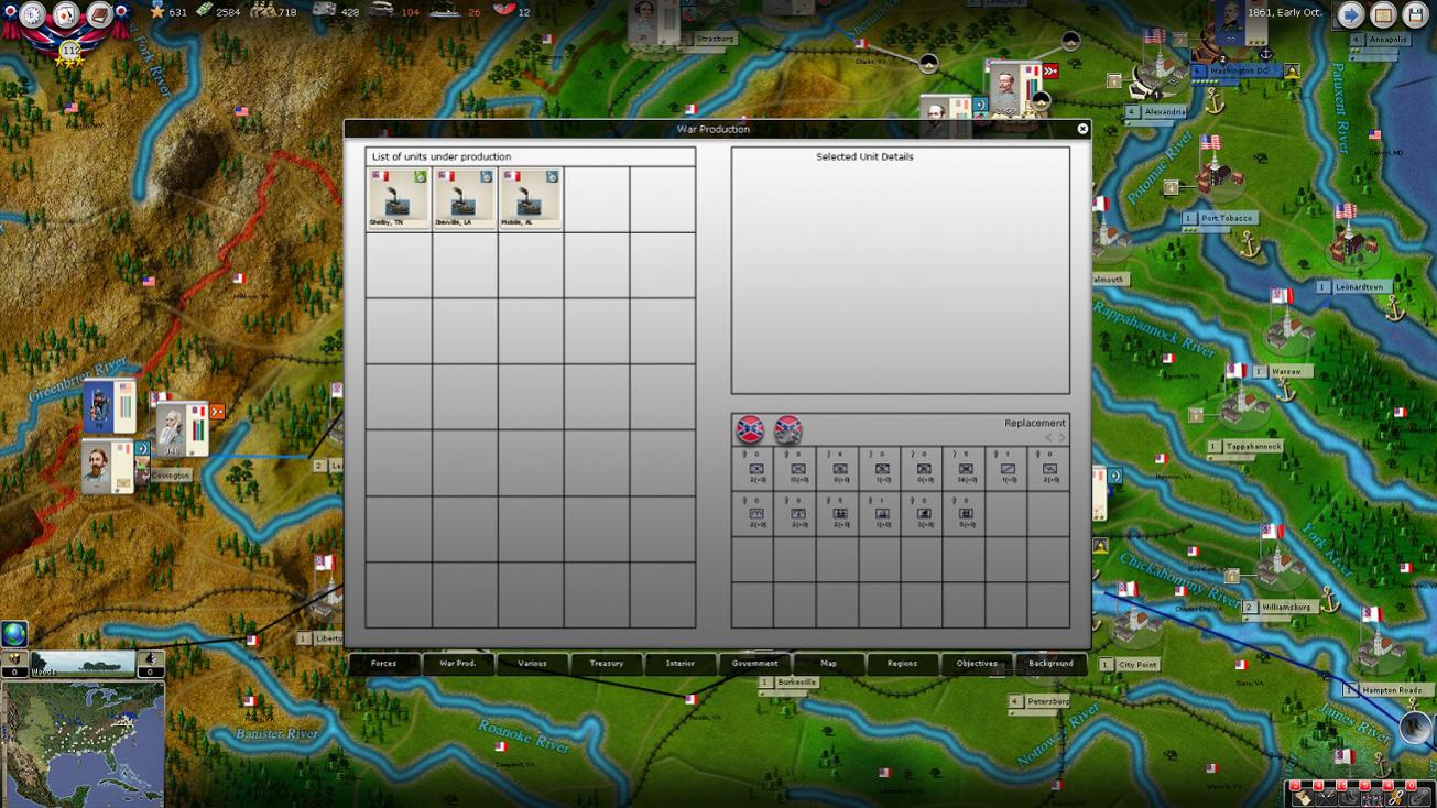 I'm playing the full April 1861 campaign as the CSA, it's early October 1861 and I noticed a number of artillery units are in the red, so I go to the replacement screen and there is no artillery displayed so I can't buy replacement chits (I can for other types besides artillery). 1st attachment has the screenshot, 2nd is the game file. I tried clicking on the arrows in the replacement area of the screen to see if it would scroll and display more unit types, but no luck.