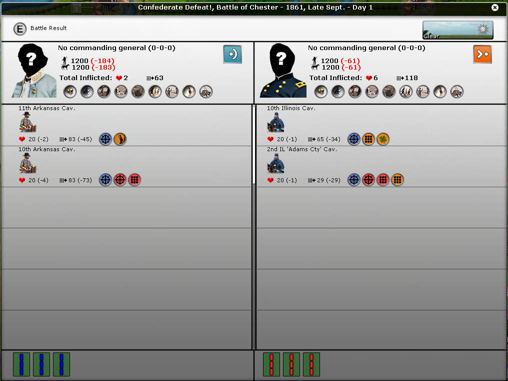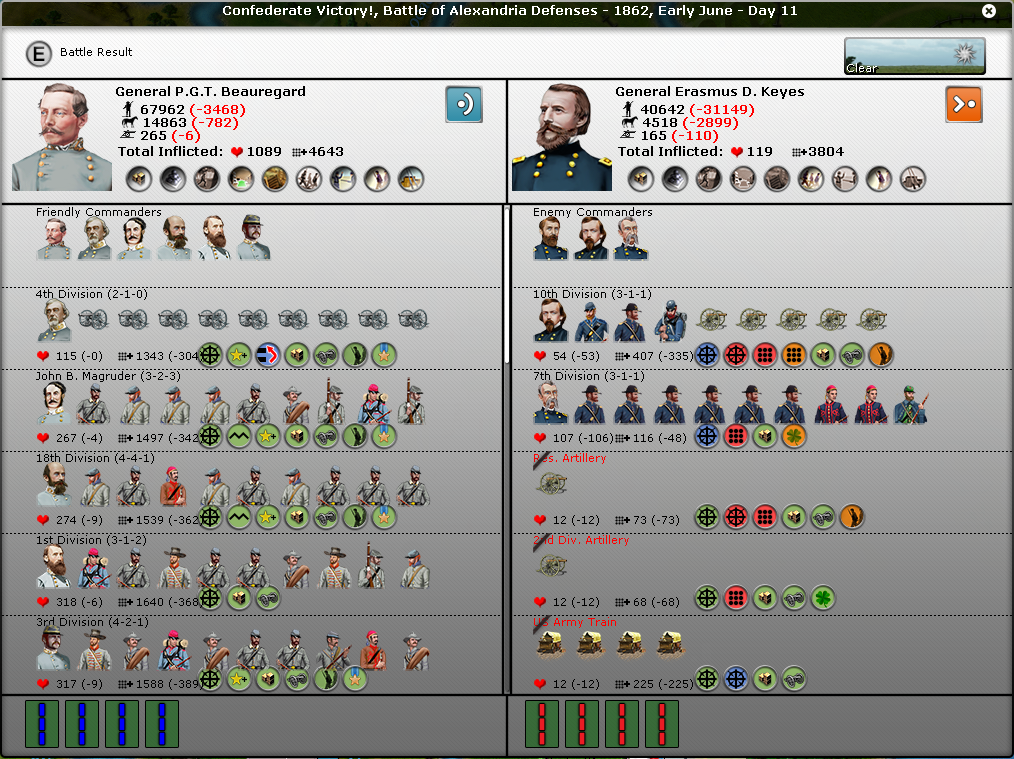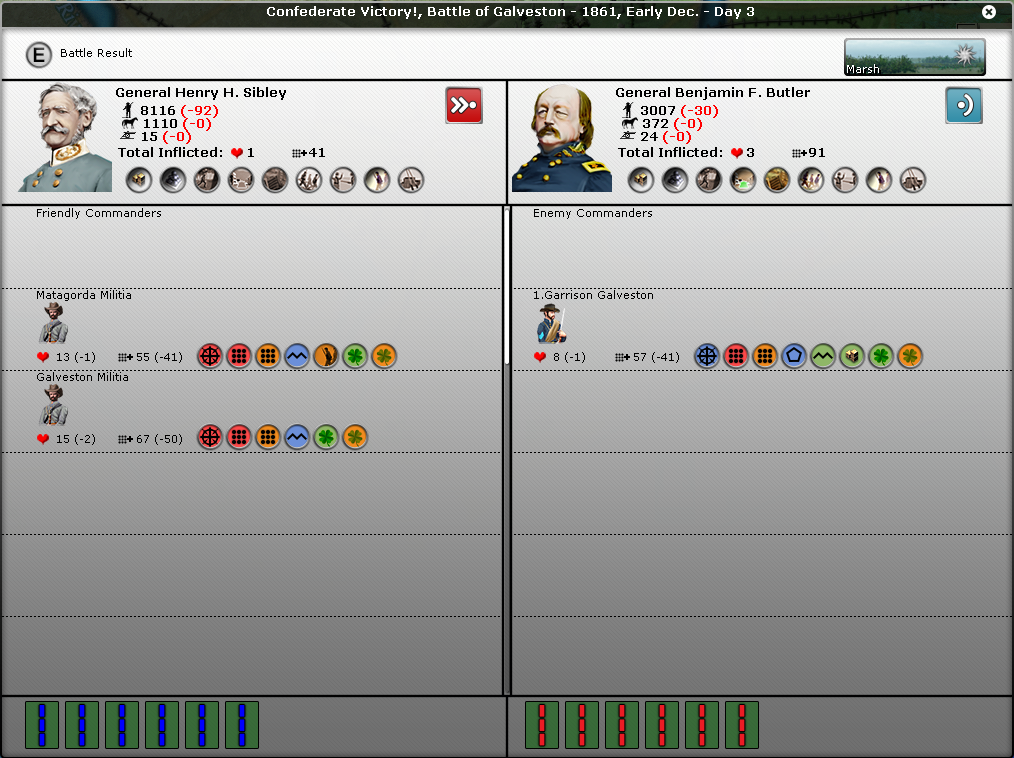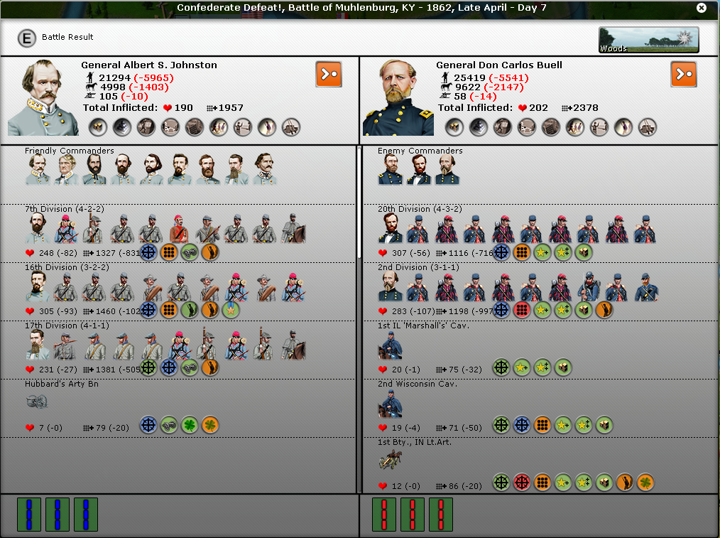 FYI, I noticed in many of your battles that you don't seem to have the intrinsic supply icon on the battle report. It's the round icon with three boxes and a green background under the troops icons. In fact, in the battle of Pensacola, Pemberton seems to have the "out of ammo" icon.