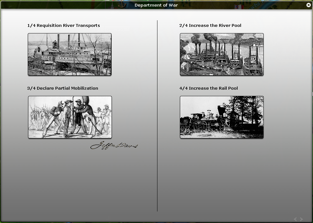 Moral is high in Confederacy (106), time to ask for volunteers has came. A prime of 1.5 dollars has been offered. Government hopes a lot of men will come, the don’t want to enact conscription. It also raised the taxes, issued war bonds and printed money, which means inflation will be 4% but money is needed!