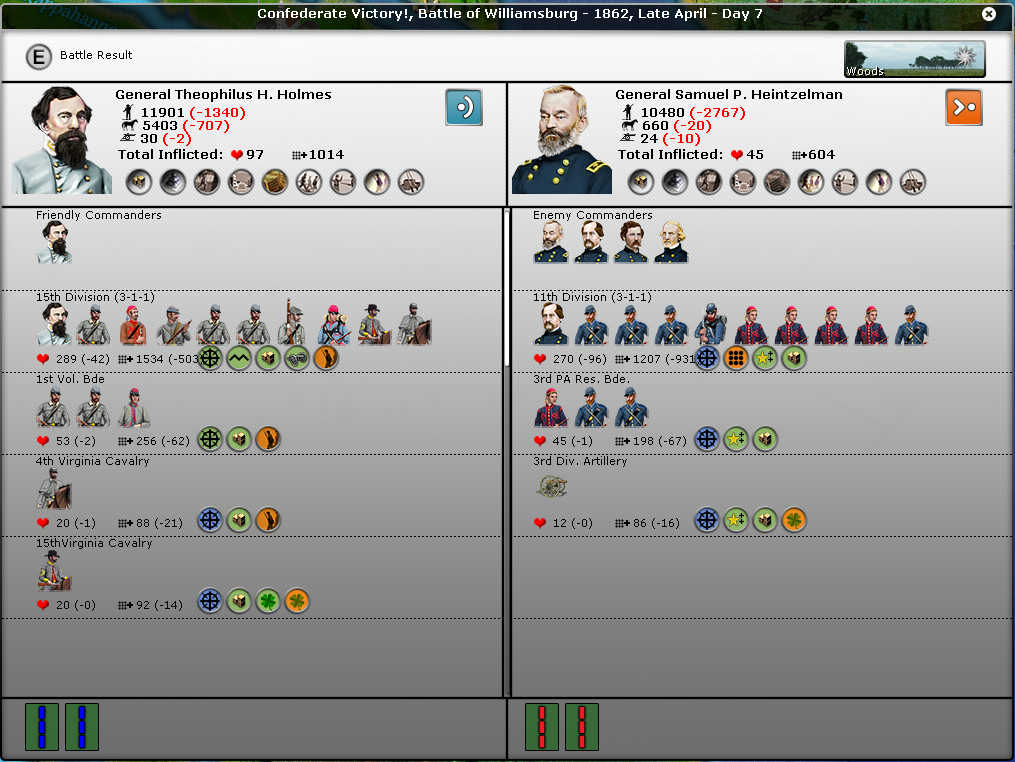 FYI, Huger has the artillerist special ability, but he really sucks as a Division commander, due to his low stats. Fortunately, the artillerist ability works for the entire stack even if Huger is a lone General. The artillery fire every round because they are support units, so I try to put one of my best Generals in command of the artillery Division. In the stack you have with Beauregard, that would be Magruder. Just my two cents worth of advice. You are really doing well and don't need any help. Perhaps I should give some advice to GWGardner.