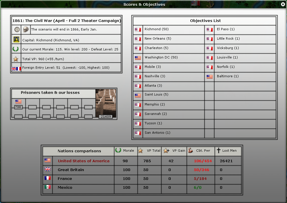 On the war field, PGT Beauregard was ordered to take Fort Sumter. Every ships were sent to the sea, to bring back from Europe everything that could be used for the war in exchange of king cotton despite the fact that Union claimed blockade of Confederacy.