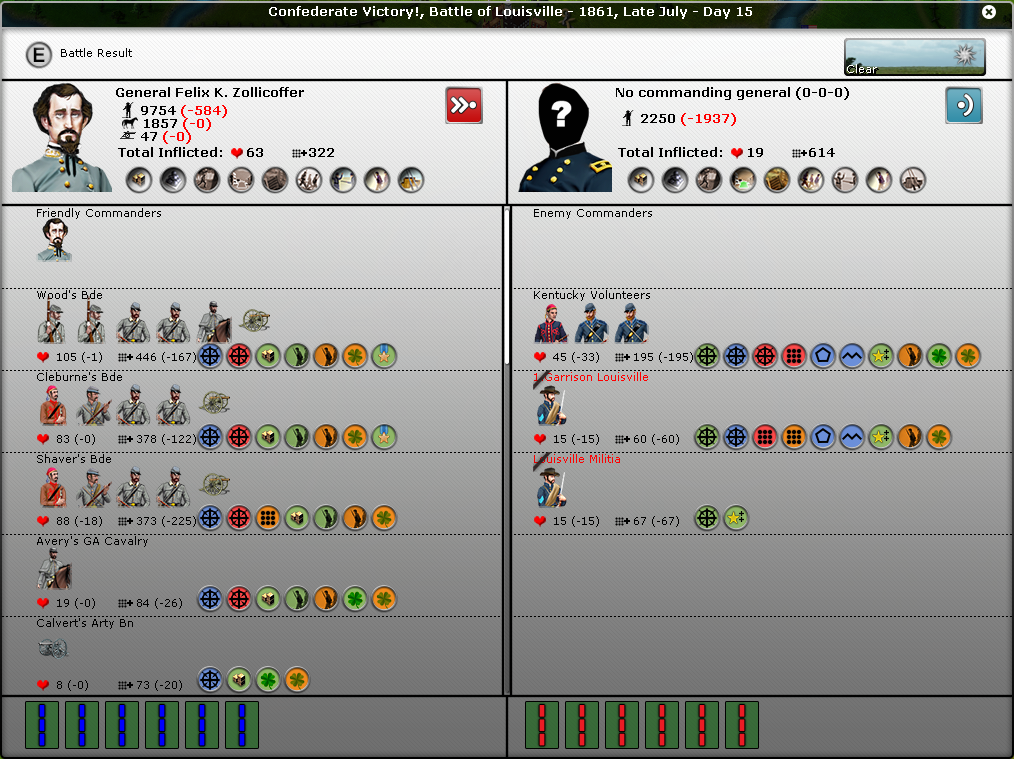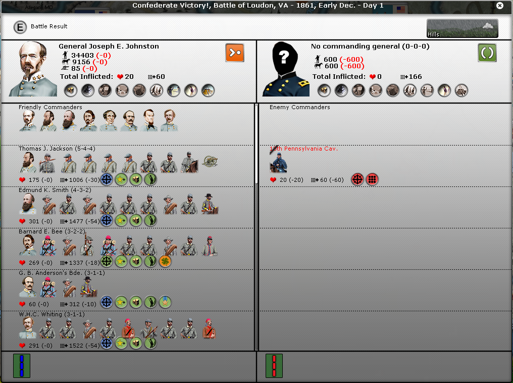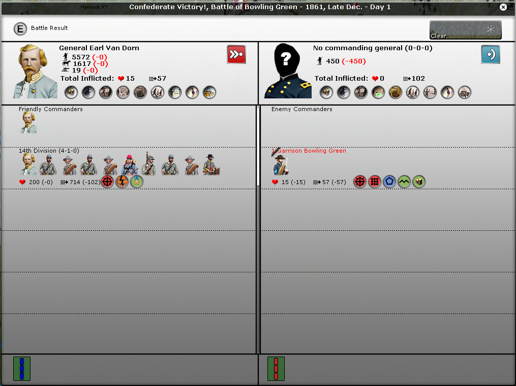 FYI, I noticed in many of your battles that you don't seem to have the intrinsic supply icon on the battle report. It's the round icon with three boxes and a green background under the troops icons. In fact, in the battle of Pensacola, Pemberton seems to have the "out of ammo" icon.