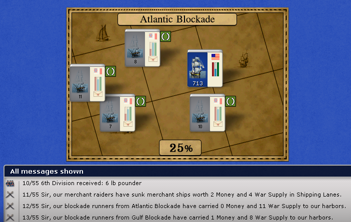 Battle on the sea is going well, a lot of supply arrived from Europe and some merchant ships were sunk, bringing money.