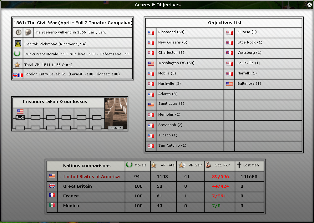 Moral is high in Confederacy (106), time to ask for volunteers has came. A prime of 1.5 dollars has been offered. Government hopes a lot of men will come, the don’t want to enact conscription. It also raised the taxes, issued war bonds and printed money, which means inflation will be 4% but money is needed!