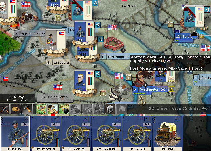 The Union move a stack into Gibson and a battle ensues, which the Union wins by the CS force breaking (it is changed to PP) and starting a retreat. Since the Union force in Gibson is unopposed, the Union now controls the region. If the Union force is composed of only milia[SUP]2)[/SUP], artillery, and pre-war cavalry, the Union player will have to put at least 1 militia or pre-war cavalry element into the city to control the city too.
