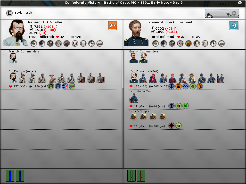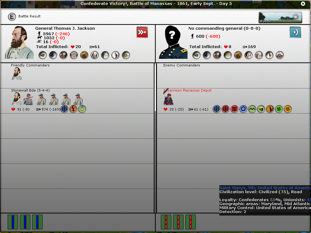 FYI, I noticed in many of your battles that you don't seem to have the intrinsic supply icon on the battle report. It's the round icon with three boxes and a green background under the troops icons. In fact, in the battle of Pensacola, Pemberton seems to have the "out of ammo" icon.