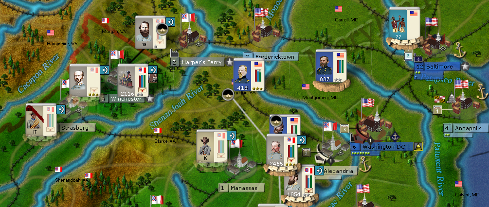 Headquarter attempts to trap enemy in Manassas. The army of Beauregard has been split in two. The general must stay with the 1st part in front of the city, making Union believe that the forces stay there too hold the city. HQ believe that Union will think that what is left moved away to West Virginia to Johnston’s army, but in fact, hiding in the city. HQ hopes that Union will attack and get decimate on this strong position. On the same time, if the plan doesn’t work, Jackson and the troops recruited in Richmond are traveling to Manassas witch should give CSA a large army, able to force Alexandria defenses.