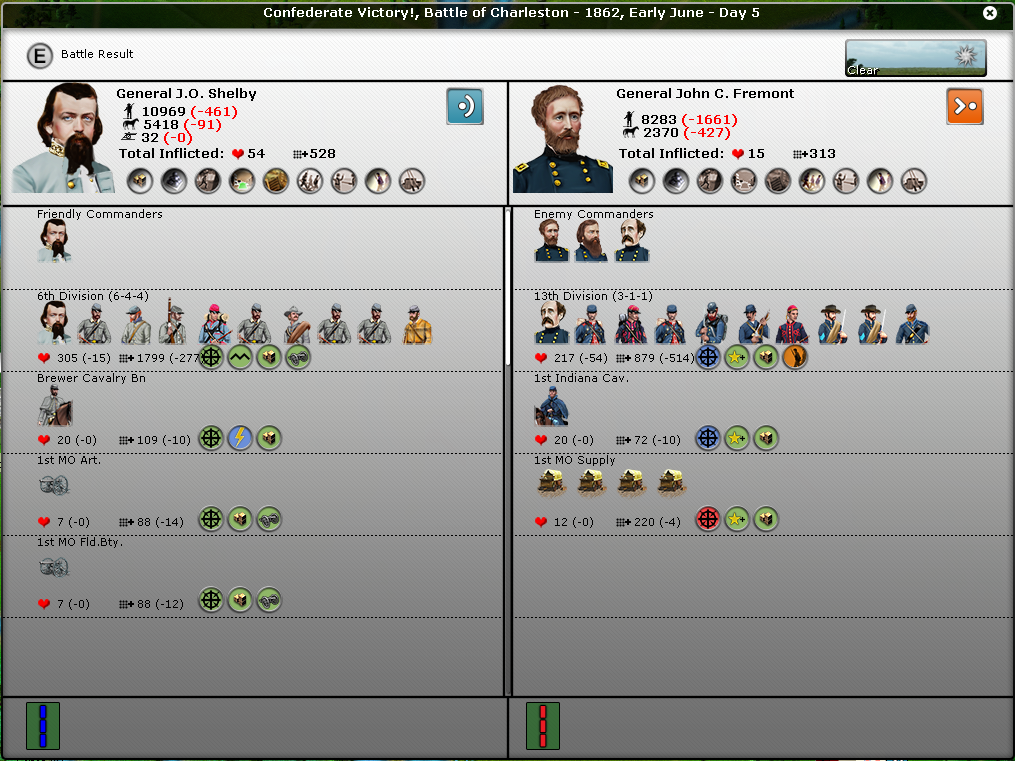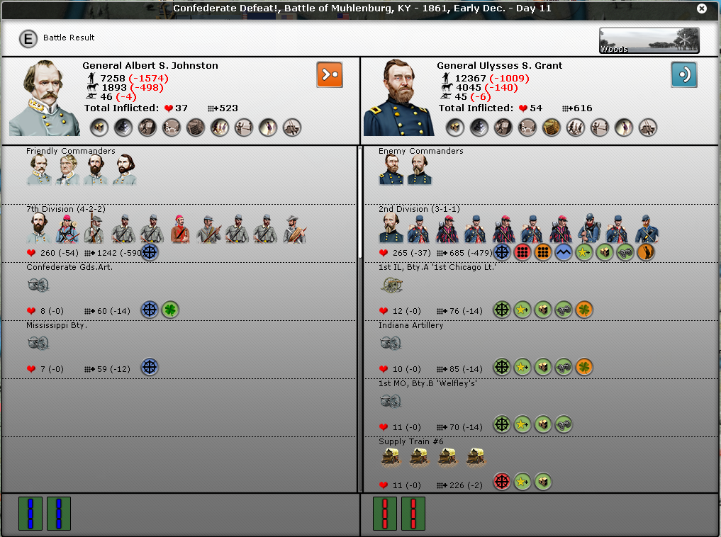 FYI, I noticed in many of your battles that you don't seem to have the intrinsic supply icon on the battle report. It's the round icon with three boxes and a green background under the troops icons. In fact, in the battle of Pensacola, Pemberton seems to have the "out of ammo" icon.