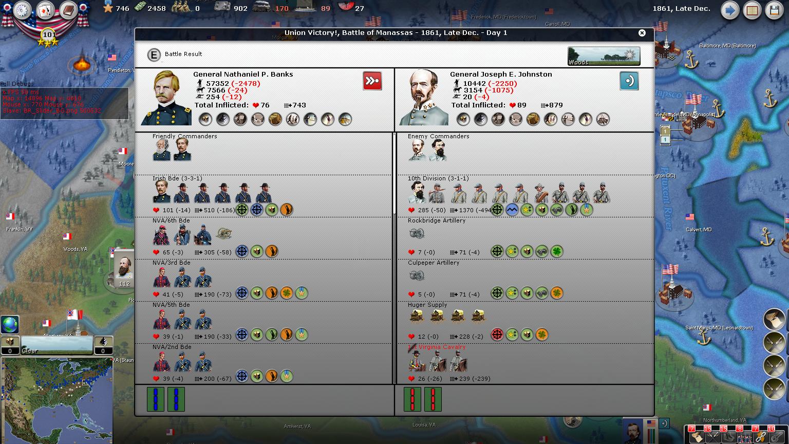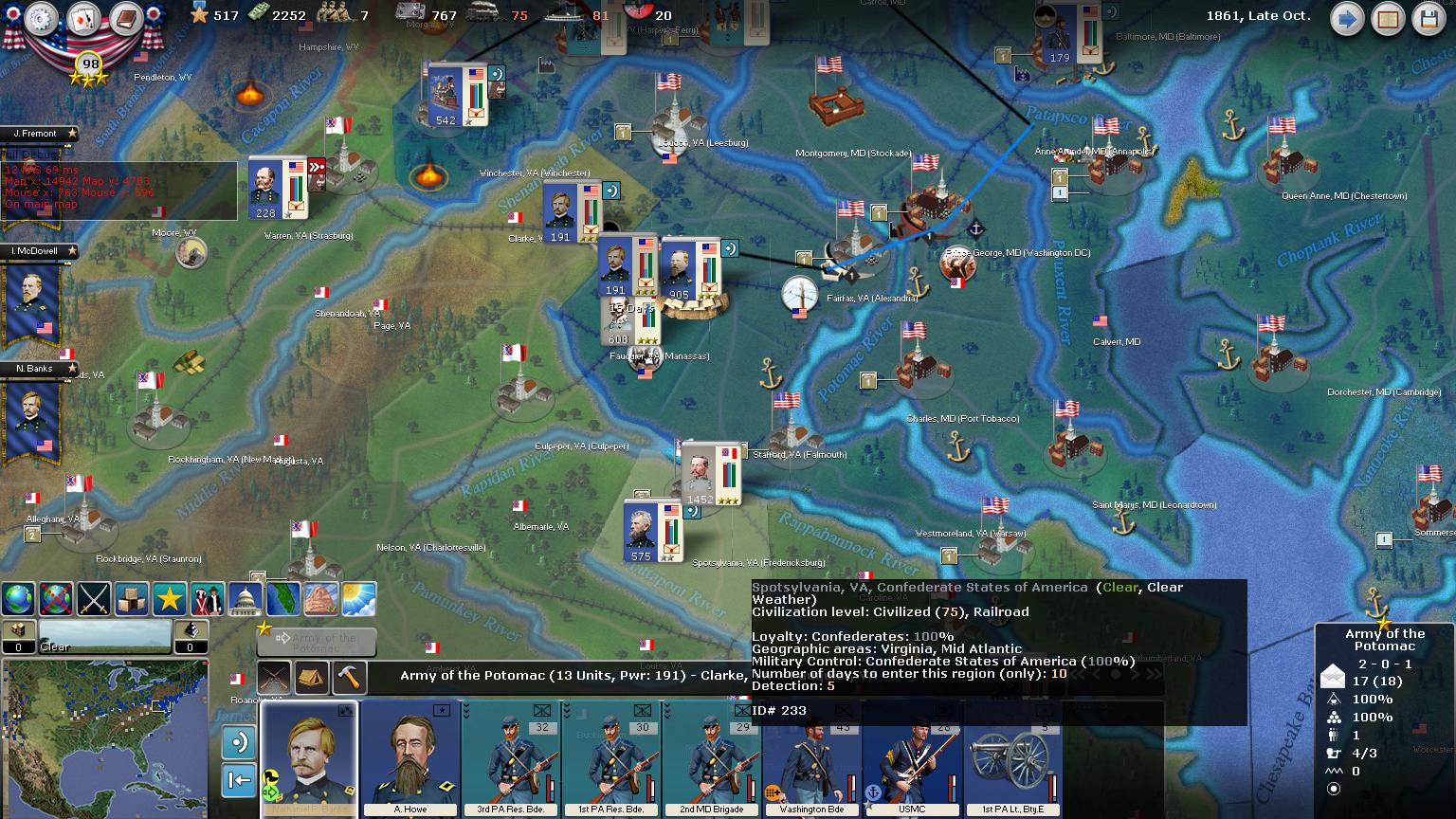 It was a big decision weather to go south or east, so we chose south to pursue Johnston in Charlottesville. Bee in Fredricksburg I think will sit tight becuase I left an army to cover my rear in Culpeper VA.