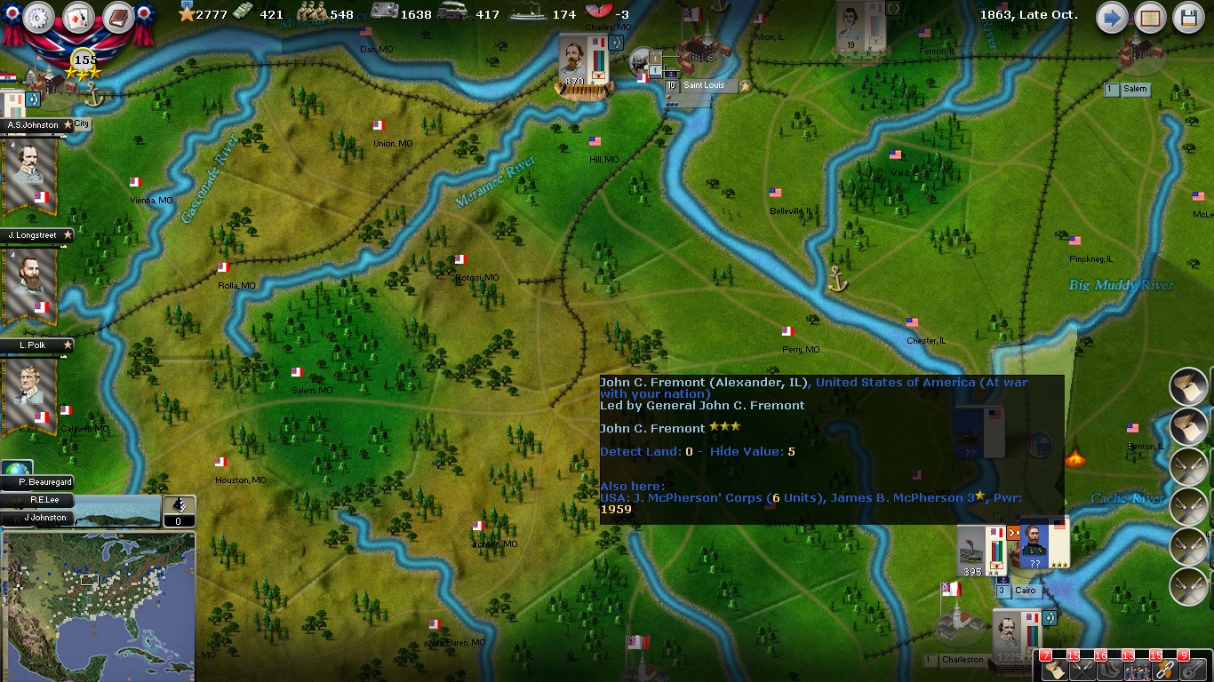 A 1100 pwr stack just finished in Alabama. Going to take out Ft. Pickens and then keep the army as a quick reaction force vs landings. My suicide cav and slight loyalty (yes, I spend all the demonstartion cards) tell me that Boston has a up to 1500 pwr stack. I have a 1200 pwr stack in New Orleans. NO has a fort, and the coastal regions have stockades with light artillery. I have shipped Alexandria Fort and Coastal Btr. to Richmond, and Annapolis, Baltimore and Philadelphia captured guns to (fort) Norfolk. I actually hold Ft. Morgan. I have 1 bde in Texas. Van Dorn took Denver (I used nearly all my partisans and copperheads aroud that region in the first two years + some rangers), which made Union move North from Santa Fe, after which I took Santa Fe. I razed Tuscon along with all the forts I could cause I invested very little in NM. I have a fort in New Madrid, with Cairo's captured guns.