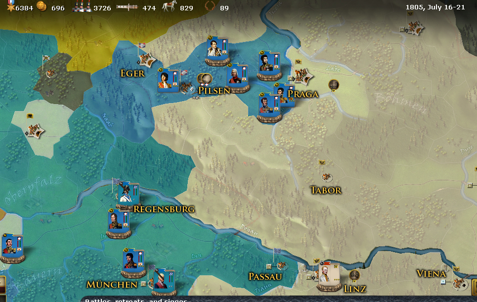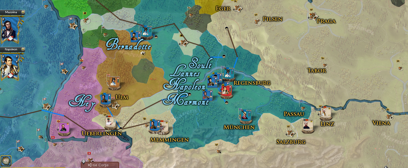 As you can see in general everything goes ver well for the French side and both Napoleon's army as Massena have made significant progress. The only drawback is the problem of supplies in Bohemia, which can be very annoying.