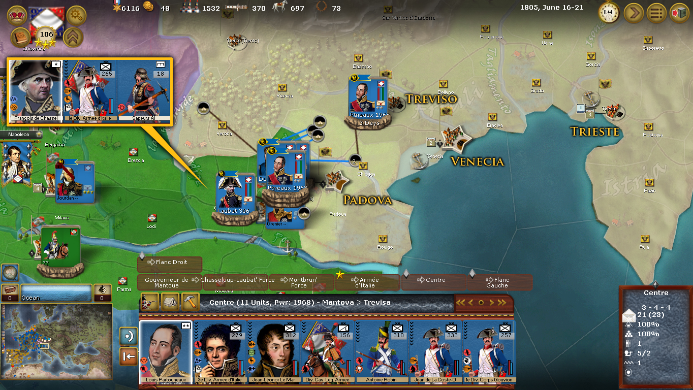 The "right wing", also with 4 divisions, is directed by Molitor, who seems to be the best overall Italy commander in numbers. Furthermore, to compensate the harsh Duhesme and Massena, he is a good civil administrator, increasing the loyalty of the people, and an officer training, which improves two conscript units to regular units per turn if he does not move.