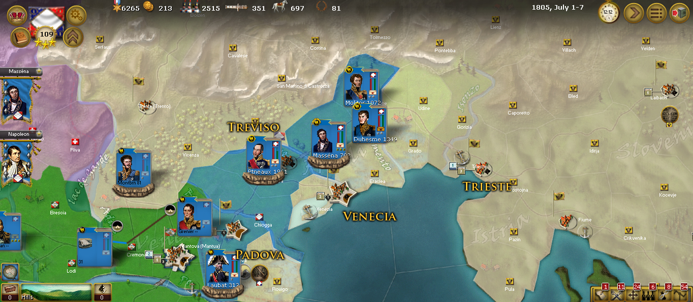 But the Austrians are not in Treviso. So Partoneaux assaults the city and takes it the last week of June, gaining 4 points of national morale. Meanwhile, the remaining corps are advancing unopposed toward Trieste. Venice is left behind because taking it would be costly without a port blockade.