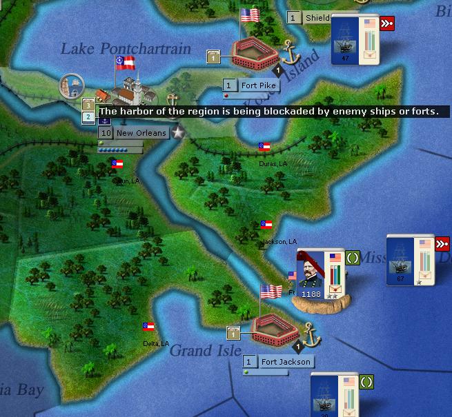 Cardinal Ape, during my test over the weekend, I noticed that NO cannot be blockaded by ships. The city harbor has two exits, the Mississippi and Lake Pontchartrain. The lake cannot be entered from the Gulf side, even if you take the fort guarding it, and the fort does not exert blockade over that route if occupied by the Union.