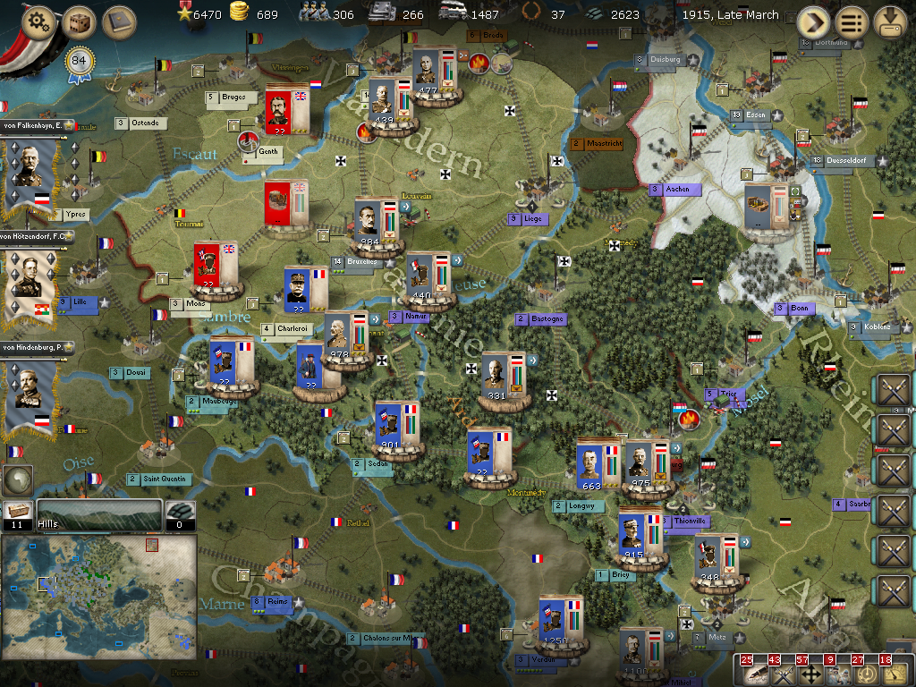 [color="#DAA520"]Belgium:[/color] Bloody Belgium. We won four battles in Mons and one in Charleroi. The losses were roughly 106k dead Germans and 162.5k dead enemy and we took 5400 prisoners. We also shot down 19 planes and lost none. The British forces in Genthe have all but abandoned that city for the defense of Alost and Tournai. Allenby's decimated force of 49 PWR is still in Mons and retreating to Alost. We will probably need to spend a turn to gather replacements, but will see if we can reorganize and push the enemy back more.