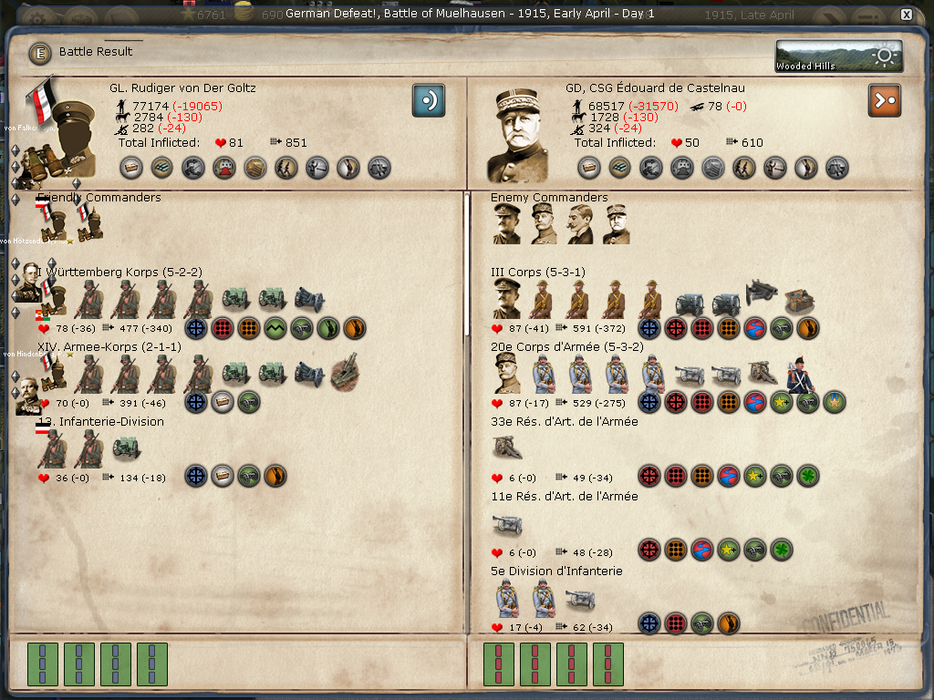 Gallieni, realizing his hubris, decided to match von Bayern man for man, and sent in 30 units to match the 26 the Germans had sent out but the wily von Bayern would not be outsmarted this day and had 80 units ready for our first line of defense with solid entrenchments. The Germans were led by von Quast's korps and von Kirbach's Korps valiantly continued on with the battle. The now desperate WE was led by no one else but 3-star leader Ferninand Foch and the 20th Corps d'Armee. Although Foch demonstrated tactical skill and his two field and one medium artillery regiments opened a devastating fire upon our brave soldiers, his men showed cowardice in close fighting when they and their cavalry approached our lines. The battle stayed tilted in our favor, but the fighting was pretty even. Would the approaching afternoon be any different?