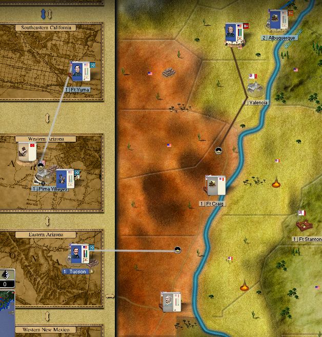 I've built a supply chain of depots from SF down to Arizona. The rebs are retreating down to West Sierra. Carson and Carleton are converging on Sibley. From there, I'll push down into Texas.