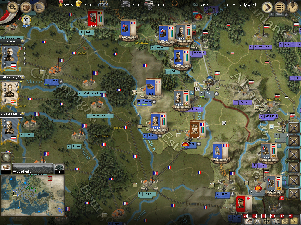 [color="#0000FF"]Southern France:[/color] The attacks from Metz onto Saint Mihiel haven't worked in the past, however, it appears to have just the one korps with 275 PWR outside the city and just a supply unit inside so we'll use a conservative assault at least for a diversionary tactic to hopefully spread the northern forces out more. The korps in Luxeuil will rail to Belfort to regain cohesion. The OHL is inactive so he'll have to stay put for another turn.