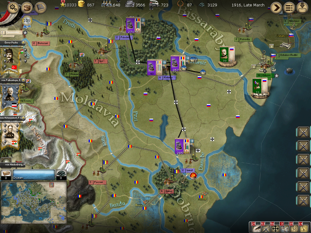 [color="#008000"]Southern Russia: [/color] We had a successful battle in Izmail and are chasing Saltza's very weak infantry division in Tatarbunary. We are also attacking a garrison unit with a Romanian Armee just north of Falechti.