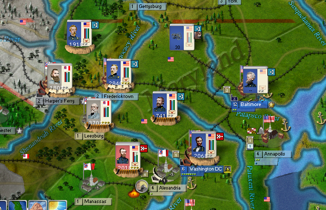 Though it was tempting to hold up for the winter and continue the coastal invasions, I chose instead to attack Alexandria while their trenches were still low. Grant took Alexandria, was beat back by Lee, crossed again, and this time held the beachhead. Sherman shifted over to Washington . A token force holds onto Montgomery under Keyes. That's the least likely spot to invade across due to supply.