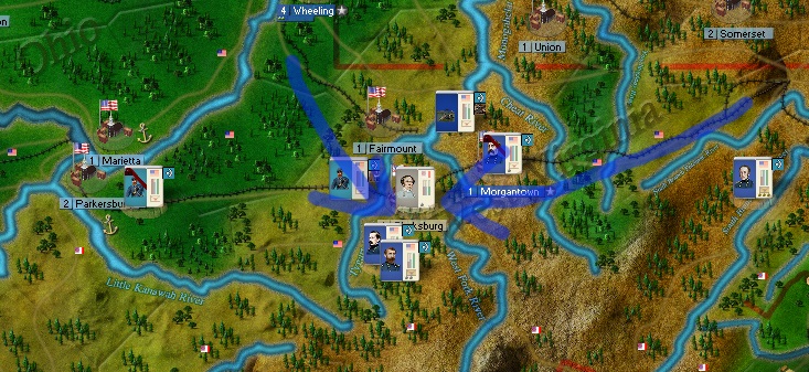 In early June, 1861, General Patterson had gathered a large group of forces in the mountains of northern Virginia, what would later become the eastern part of West Virginia - and from here on in this narrative will be. These forces were given two important tasks. One, they should secure the rail lines through the northern part of the state. Two, they should attack Confederate forces in Clarksburg in conjunction with West Virginia state militia and defence forces in Wheeling led by Generals McCall and Hurlburt. In a fit of cowardice, Patterson asked his second in command, General Hamilton, to lead the attack on Floyd, with Generals Mansfield, Keyes, and Lew Wallace leading the 6th, 2nd, and 5th NVA brigades respectively. Patterson remained in the Eastern part of the state with light brigades securing the railways.