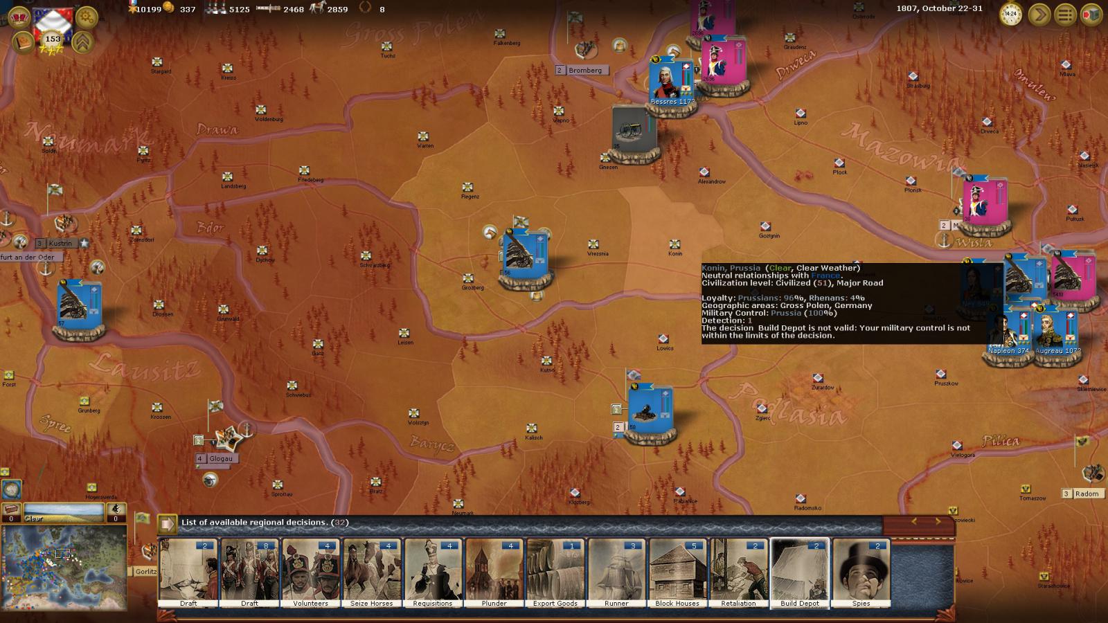 Ok, so I did Tilset (no mods this run through), and I had to pull back to the Duchy of Warsaw as they are now allied with France. I have spent most of the summer of 1807 re-furbishing 5 Corps there. Going good, those blockade runners can do wonders. Now it is the first week in October, and the supply stocks of Warsaw, or at least the supply levels of my rejuvenating Corps stationed there are diminishing (once again). I do not know what to do, seeing as I would have to travel all over Prussia to get back to safe territory. I cannot build depots in Poland, so Napoleon and a good chunk of his Grande Armee are going to be in serious trouble come the snows/blizzards/harsh weather/whatnot. I have three Corps plus Grande Armee in Warsaw, I have two in Thorn. I am not playing with easy supply (!), but this is really beginning to trouble me somewhat in how to not STARVE and decimate my Armee for another year. Austria are starting to once again become a threat, so I only have Murat, Bernadotte, Marmont and the Army of Hannover (plus a few new divisions) in French territory. How do I avoid becoming starved during the 1807/08 winter in an allied country, far away from hope (and causing another war with Prussia)?