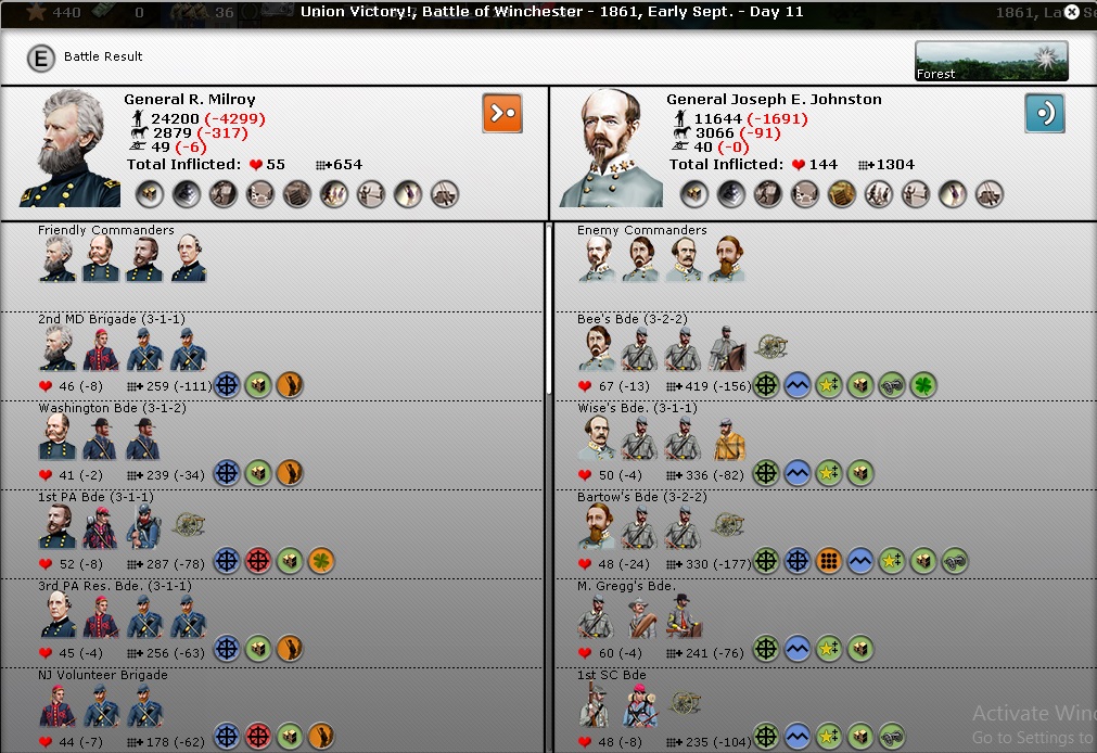 Nathaniel Lyon became famous with his securing of central Missouri. Asboth having secured Jefferson City and loyal militia securing Rolla (where the confederates had burned the depot in a militia-led raid), Lyon began gathering forces in Camden County between Springfield and Jefferson City [incorrectly called Erie in the game, I don't know of any Erie Missouri between Springfield and Jefferson City]. Those forces were waiting the arrival of supply wagons as well as the establishment of depots, which were being built along the Missouri in Jefferson City and Leavenworth, Kansas as well as in Parkersburg, WV. Encamped with about 6,000 men, Lyon was personally accompanied by a brigade of Kansas Mounted Volunteers with General Morrell heading the 2nd Missouri Brigade and General Wood heading a brigade of Western Volunteers. General Shelby led a force of nearly 10,000 including his own accompaniment by a brigade of Missouri Cavalry, and Weightman's Brigade (now under General Thomas) and Bowen's Brigade (now under General Whiting). Morrell's Missouri Brigade performed especially well against an attack by Bowen's (Whiting's) Brigade and one regiment of confederate Missouri militia charged into Lyon's Cavalry but was entirely wiped out through casualty and desertion (no prisoners were captured on either side) when they met a regiment of regular infantry. This battle occurred on July 10.