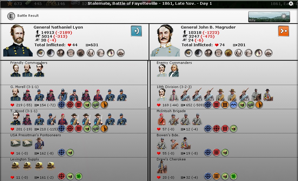 In late September, Lyon consolidated his hold on Springfield, capturing the city and its militia garrison in its entirety. He also destroyed the Arkansas light infantry brigade, a total of 1290 confederates while losing only 123 men when the 2nd Missouri Brigade charged prematurely. Lyon, Morrell, and Wood all performed excellently. On the 30th of September, Magruder returned to the area attacking Lyon's force with materially the same force as earlier in the month, totaling now 7,600 men against Lyon's now 13,500 men - having replaced his losses in a ratio of almost 1:1. Lyon won this battle as well, losing about 1,300 men to Magruder's 1,100. Magruder's McIntosh brigade faced particularly troubling losses.