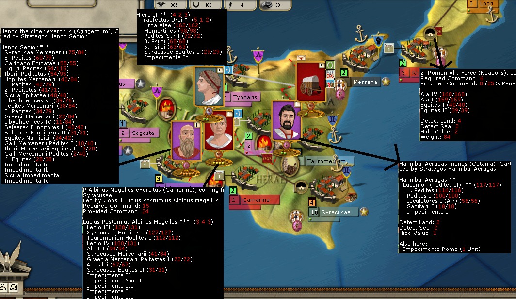 Hiero and his armies quick recovery has allowed me to send on the majority of it to merge with Lucius. This will give me a stack in Camarina of about 2500. All the units within it will nearly be at full strength. The vanguard will be made up of two legions and a unit of Syracusan Hoplites. They alone have a pwr value of are nearly 700.