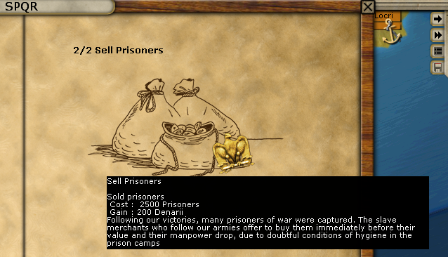 Henna finally surrendered. Gained 1 NM from the surrender. The Massalian fleet got hit by a storm on the way to Ostia. Didnt lose any elements but took a fair amount of hits :( Gained 1 EP from strategic decisions. I will need plenty more as the option to persuade Emporiae to join our cause costs 20 EP. I am able to sell more prisoners again. Another 200 D to spend nearly all on Replacements. Hanno retreated all the way back to Lilybaeum.