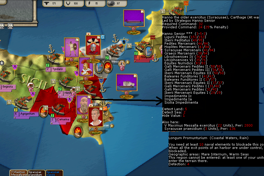 Strange occurrence last turn. Stratego marched into Syracusae but no battle occurred. There is an engagement message in the log though. The province is under 100% Syracusan MC. I had presumed that Stratego would not be able to enter the province without fighting when MC is that high. Maybe it's just a glitch. Or maybe both sides arrayed for battle every morning but neither side decided to strike first. I expect there to be a battle next turn. Stratego's supply situation can't be great. Particularly as he left Camarina pillaged and due to the MC he will not be able to forage for any Supply in Syracusae. Even though there was no battle Hiero's army and navy are now unlocked. :)