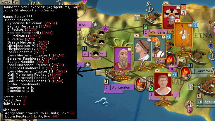 Hiero will see out the siege of Henna. The forts pwr value is down to 18 so should fall next month. He will then head to Messana. If I can get that small force to cross the straits next turn he will merge with them. I plan on using him to hunt Hannibal out of Catania if he still lurks there.