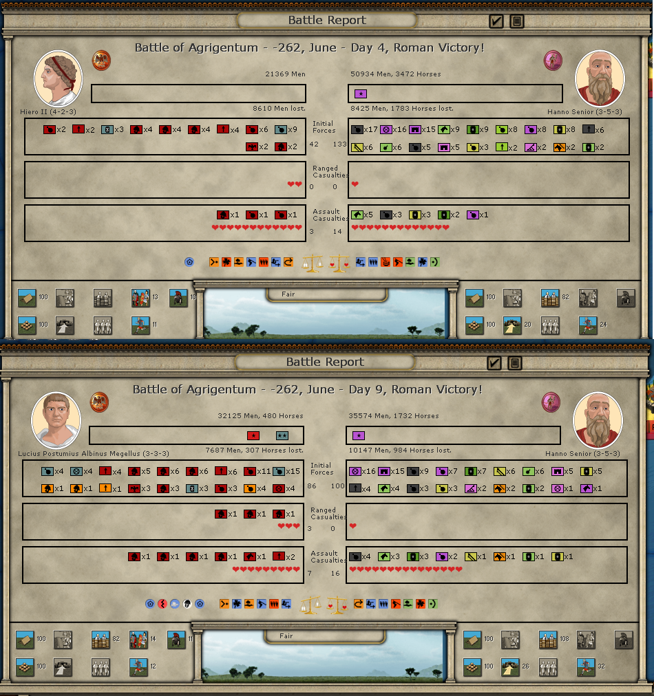 Max and Hiero will remain on the defensive in Syracusae. Max's units regained cohesion, supply and received several replacements for their damaged and missing elements. I still have a few replacements in the bank to replace a few other elements.