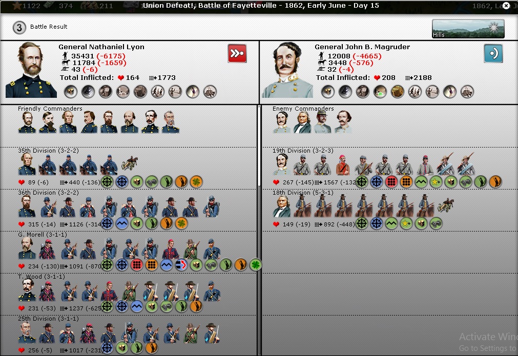 Nathaniel Lyon became famous with his securing of central Missouri. Asboth having secured Jefferson City and loyal militia securing Rolla (where the confederates had burned the depot in a militia-led raid), Lyon began gathering forces in Camden County between Springfield and Jefferson City [incorrectly called Erie in the game, I don't know of any Erie Missouri between Springfield and Jefferson City]. Those forces were waiting the arrival of supply wagons as well as the establishment of depots, which were being built along the Missouri in Jefferson City and Leavenworth, Kansas as well as in Parkersburg, WV. Encamped with about 6,000 men, Lyon was personally accompanied by a brigade of Kansas Mounted Volunteers with General Morrell heading the 2nd Missouri Brigade and General Wood heading a brigade of Western Volunteers. General Shelby led a force of nearly 10,000 including his own accompaniment by a brigade of Missouri Cavalry, and Weightman's Brigade (now under General Thomas) and Bowen's Brigade (now under General Whiting). Morrell's Missouri Brigade performed especially well against an attack by Bowen's (Whiting's) Brigade and one regiment of confederate Missouri militia charged into Lyon's Cavalry but was entirely wiped out through casualty and desertion (no prisoners were captured on either side) when they met a regiment of regular infantry. This battle occurred on July 10.