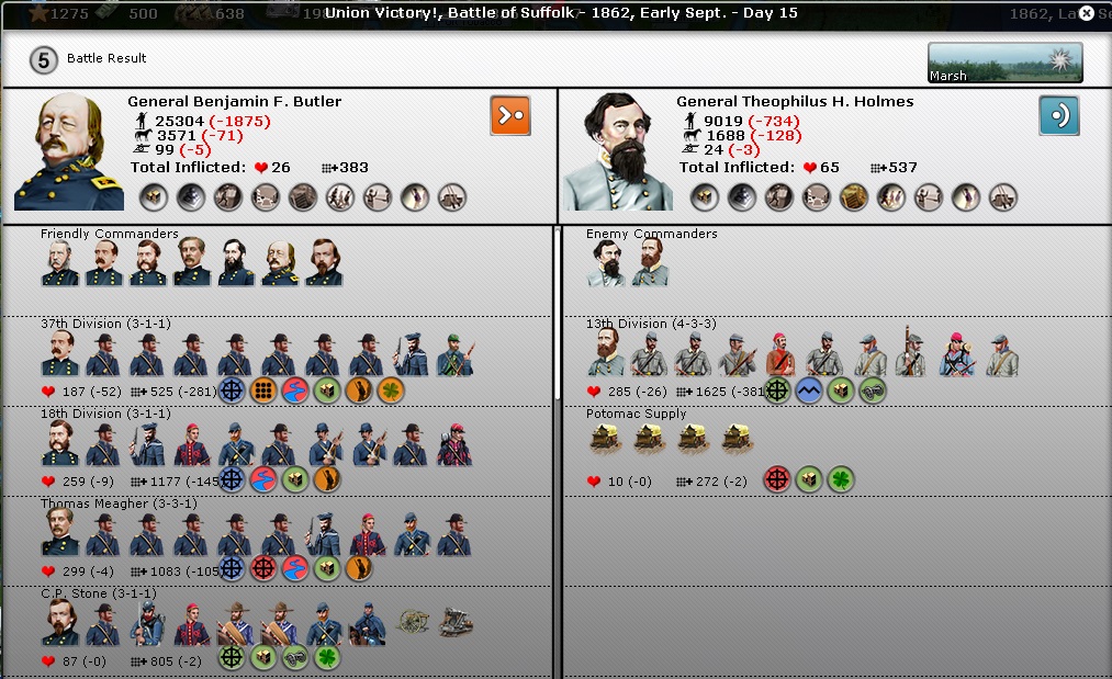 [I'd like to add one more note about generals and especially corps commanders like Kearny. I ignore the general's statistics as best I can, I'm not sure I should really know these things in a historic sense. I prioritize giving divisions to leaders with the highest seniority, and if a general leads a division, I don't like giving it to a new general. I have three Armies in Virginia, Banks with a small militia garrison recruiting contraband in Norfolk with a corps on the Penninsula and another in Suffolk, Butler who has just been kicked out of Richmond and whose corps under Hooker may be transferred to McDowell and whose is a general without an army right now and is being sent to the Valley, and McDowell, whose main corps are a smaller one under Buell in the Valley and Kearney in Fredericksburg. Howard and Crittendon also lead important and active corps. Anyway, corps commanders statistics for Banks' and Butler's corps have some malus due to those commanders low statistics. At times, McDowell's corps also have a mallus, although right now everyone is within his strategic command radius and he's gained a level so he is 2-2-3 and isn't giving anyone a mallus. So when you see a corps fighting, remember that its statistics may not represent only the ability of the corps commander, but also that of the Army commanders who are much weaker. I do avoid putting good corps commanders under bad army commanders, Kearney and Howard were given more active commands than Dix, for example.]