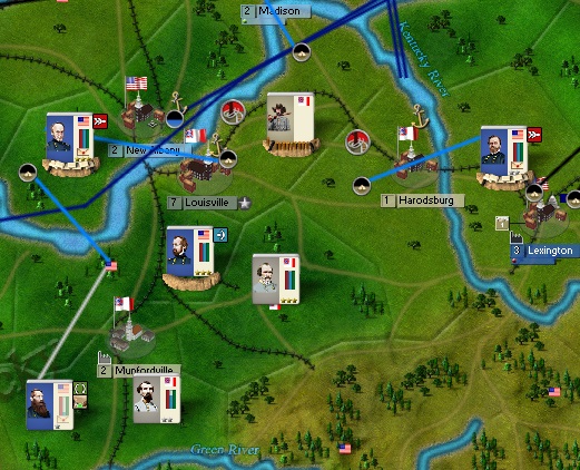 Overall it is a solid B-. You haven't outperformed history, but you haven't lost any armies (no Fort Donelson). I prioritized HF, Missouri, and West Virginia early, so there wasn't much you could do. I got lucky dislodging you from Manassas, we'll see what is next there. Lee out West is gutsy, so you get points for that. And Kentucky was well done. I'm not super weak in Louisville, but I am trapped."