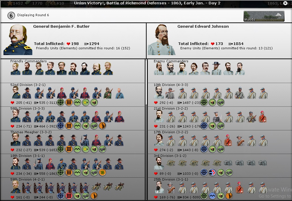 Round 6: USA inflicted 198 hits, CSA inflicted 173 hits [but 90 Union hits were against N.S. Evans' division which only had 11 hits available so Union may have really been something like 119(?)]