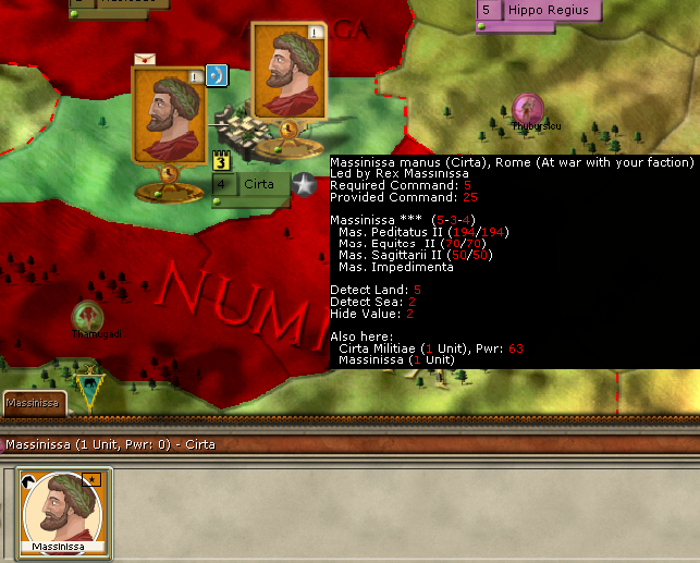 As seen, it is possible to end up with two Massinissa units in play. This is caused by the Carthaginian diplomatic option to form an alliance with Numidia (evt_nam_CAR_AllianceWithNumidia213).
