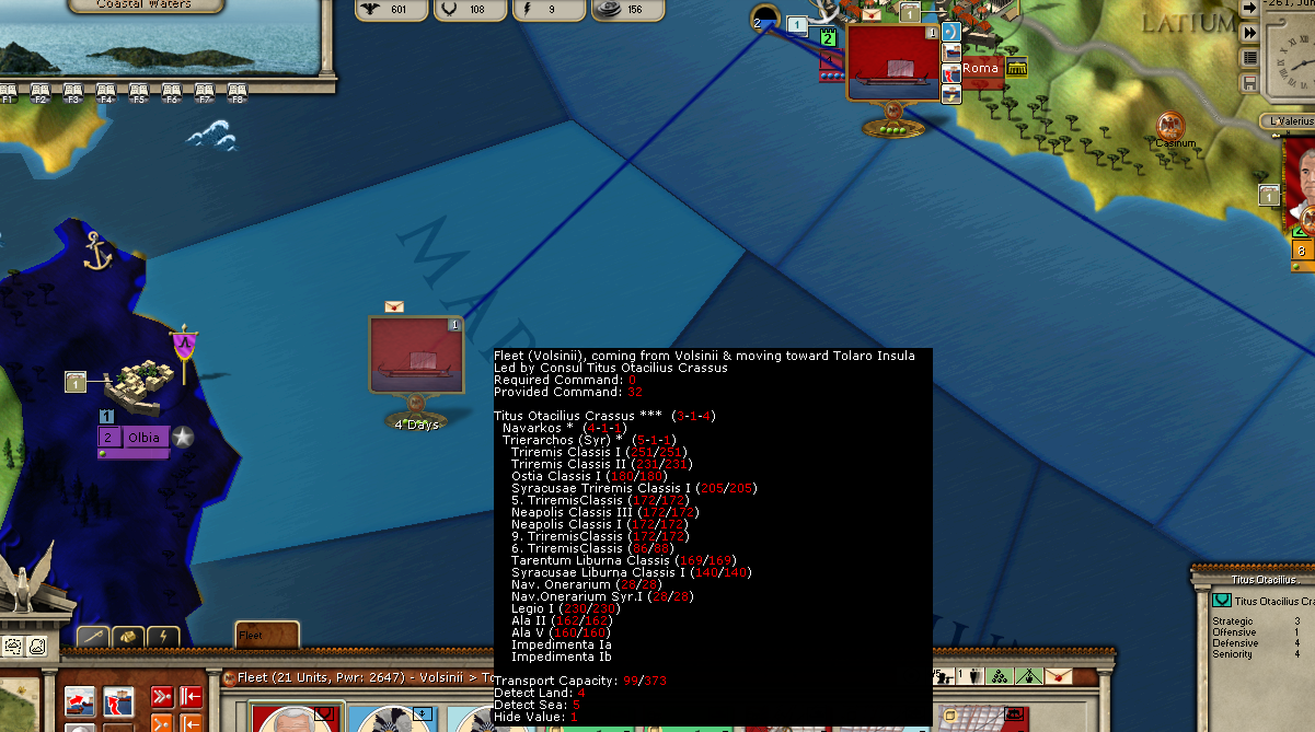 Hiero has managed to get himself drunk as a skunk and is now incapable of carrying out any orders (Locked). Titus will assault Olbia and my two fleets will merge in the sea adjacent to Ostia. The Last time Carthage sent their fleet to intercept it arrived via the West coast of Italy. We will see.