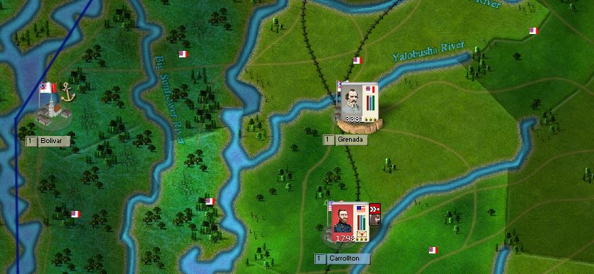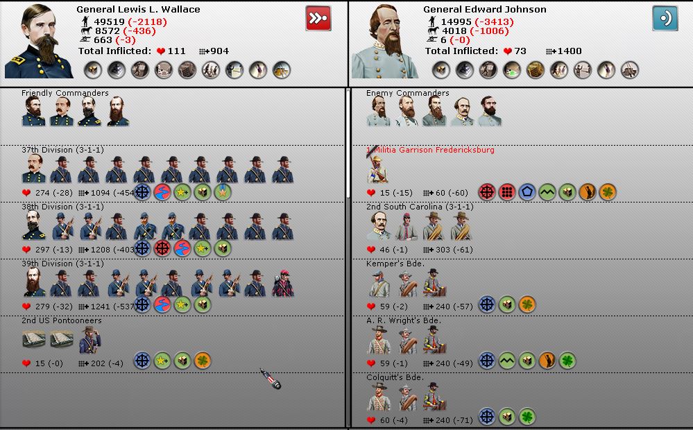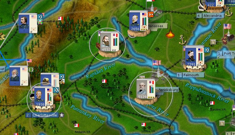 What I do in the east is usually build a couple of iron works, print money and take some inflation and get more numbers against the Rebels. The sweep around Shenandoah usually is enough to push the Rebels out of Manassas and Culpepper. Tyler has developed a strategy to counter this. Note the numbers he has in Manassas, Culpepper and Nelson. Almost 9000 CBT. I have 10,000 CBT in the area, not including 2500 more in Kearny Corp doing the right hook, but his positioning is forcing me to defend Washington, well Alexandria to be exact, so I can't push around as many troops as I like. His position also gives him interior lines so he can quickly shift his forces.