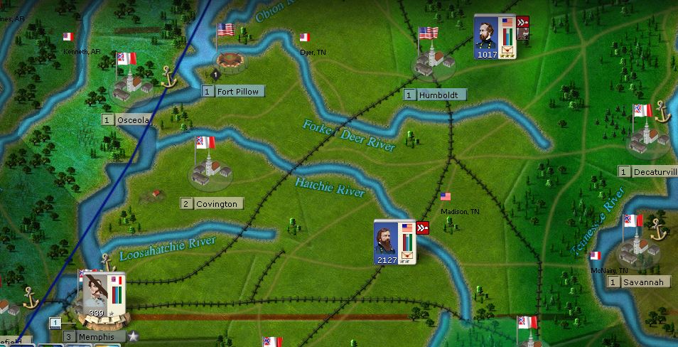 Memphis is back in Union hands. Though it's tempting to take Madison, Rosencrans and Pope will push south and tighten the net on Johnston. Lyons pushed through an undefended MO river transported over from Ozark into Vicksburg. He'll join Grant in Jackson and await Johnston's attack. At this point, either Tyler has to start defending a huge swath of land between Memphis/Vicksburg or attack Grant and hopefully smash Grant's army and then turn north. This is how I get the Rebels to attack my entrenchments.