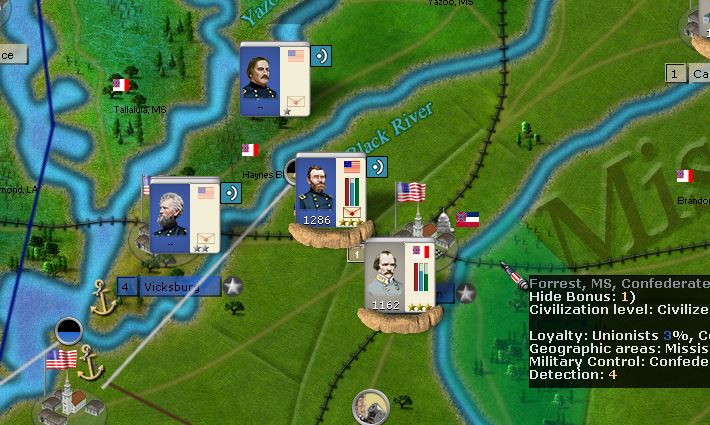 The reason why they have clear sailing is because of Vicksburg. After taking it, Grant pushed east to Jackson, cutting the only rail line into New Orleans. From Jackson, he split his forces, sending Sherman south towards New Orleans and pushing north into Carrolton. Johnstons Army outnumbers Grants by 2-1. But I'll give ground and form up 4 corp around Jackson.