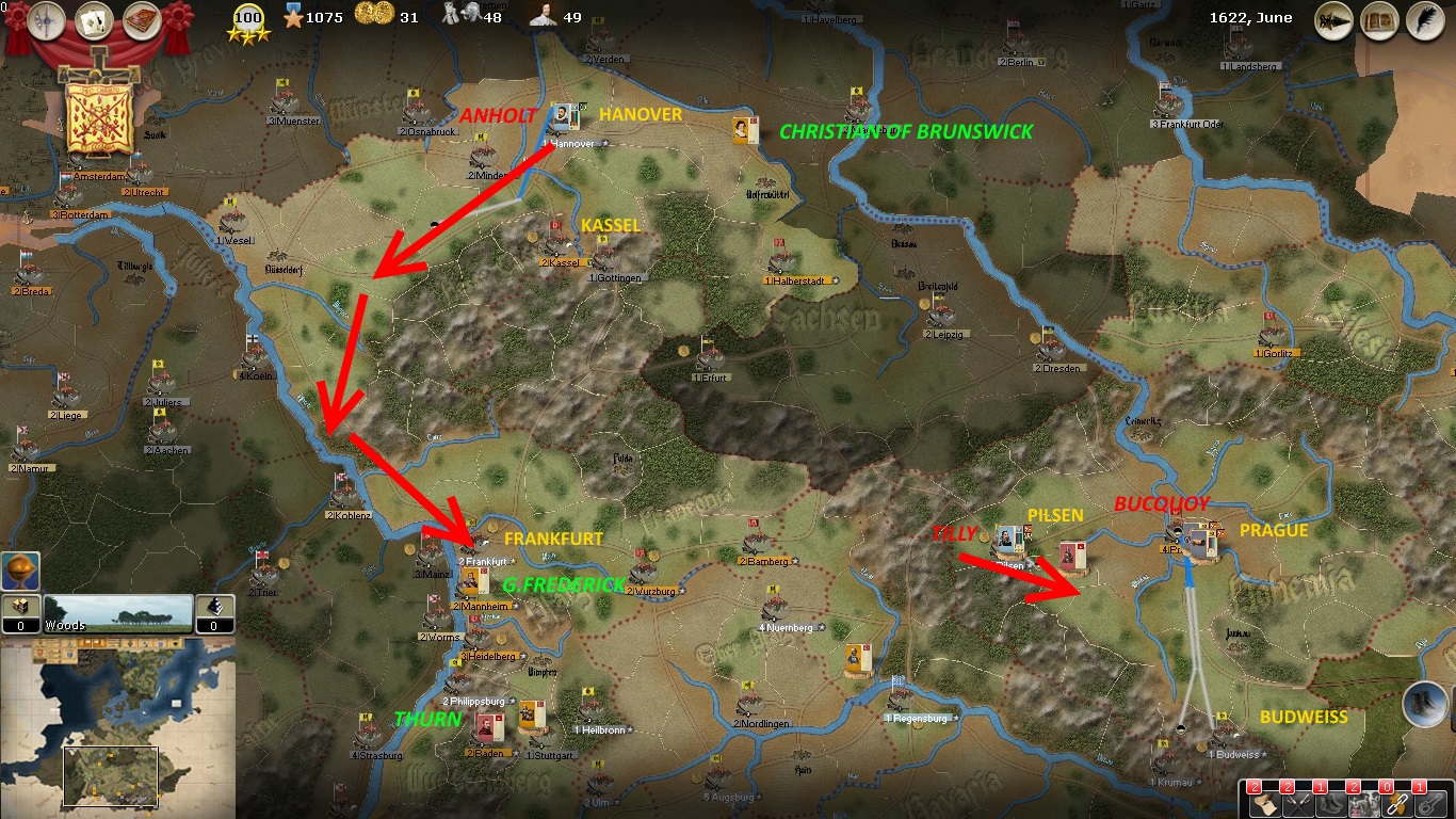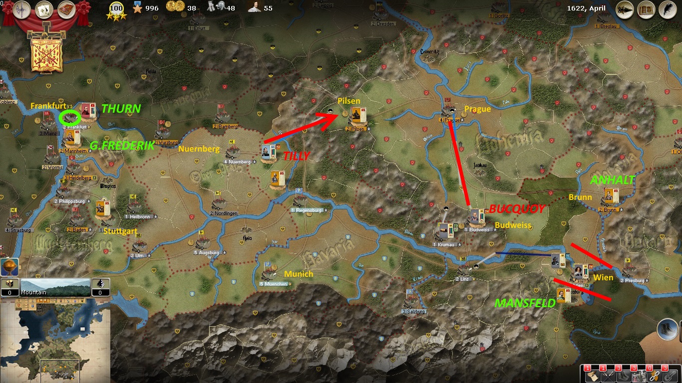 To make up for the failures of 1621, the Emperor demands an aggressive plan of campaign for 1622. Bucquoy will strike north to Prague and Tilly will move east to invest Pilsen. If successful these twin attacks will crush the Bohemian rebellion in just a few months. Marradas' dwindling force will hold at Wien. The Imperial cause was bolstered over the winter by money from Wien, Bavaria and our Spanish cousins. Let's see if we can put that money to good use!