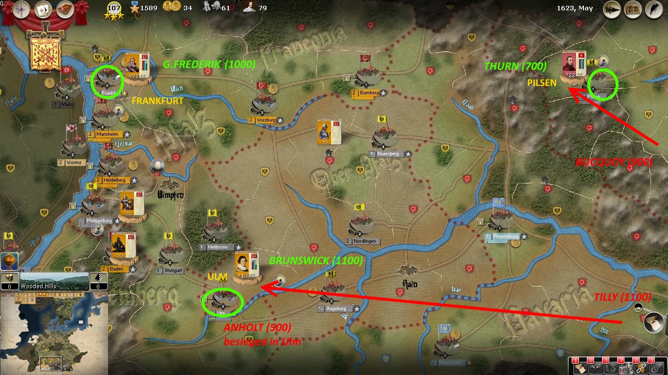 Tilly arrives in Augsburg to be met by messengers from Ulm: the city is almost out of supplies and will fall soon. Rest for his force is now out of the question. Tilly will have to march on Ulm immediately. The garrison at Frankfurt is also out of supplies, but no help can reach them in time, especially against George Frederick's huge army. In the east, Bucquoy will attack Brunn, seeking to disperse the small Protestant force there.